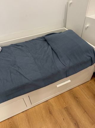 Cama nido de Ikea en color blanco, con un diseño funcional y práctico. - Incluye dos cajones de gran capacidad. - Tiradores blancos integrados en los cajones. Tiene marcas en un cajón, como se observa en las fotografías.