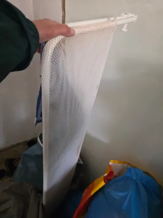 Barrera de seguridad para niños, ideal para mantenerlos a salvo en casa. Es plegable y fácil de guardar. - Estructura metálica blanca. - Diseño de barras horizontales.