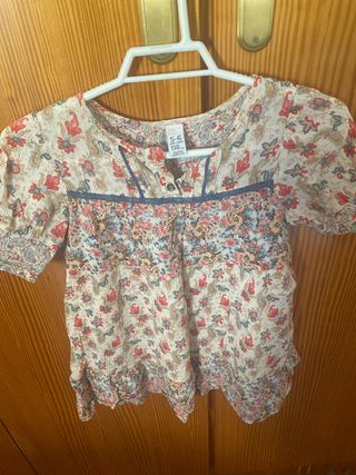 Vestido infantil con un bonito estampado floral y detalles en azul. - Manga corta. - Cuello redondo con botones. - Tejido ligero.