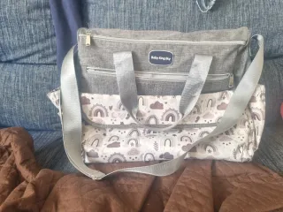 Bolso cambiador para bebé con un bonito estampado de nubes y arcoíris. El bolso es de color gris y tiene asas plateadas. - Estampado de nubes y arcoíris. - Asas plateadas. - Compartimento principal con cremallera. -Dos compartimentos en el lateral - Bolsillo detrás de la mochila - Estructura bastante grande y espacioso