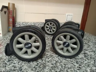 Juego de ruedas de repuesto para carro de bebé Mini Buggy de la marca Easywalker. Diseñadas para facilitar el movimiento y la maniobrabilidad. - Ruedas delanteras y traseras. - Diseño compacto y ligero. - Compatibles con modelos Mini Buggy.