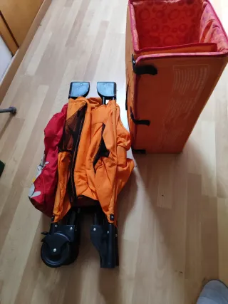 Cuna de viaje plegable en color naranja. Fácil de transportar y almacenar. - Estructura resistente. - Laterales de malla transpirable. - Diseño compacto al plegarse. -Inclye colchón plegable azul oscuro, tiene un pequeño rasgón de la mudanza ( ver fotos) - Regalo juego de sábanas y protector de colchon A recoger en Ugena, Toledo