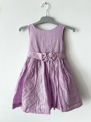 Vestido de ceremonia o fiesta en color lila de la marca Mayoral. Usado una vez. - Talla 104, equivalente a 4 años. - Cinturón decorado con dos flores. - Falda con vuelo y pliegues.