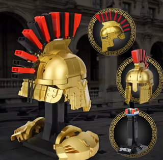 Pieza de construcción detallada de un casco espartano. - Diseño inspirado en la armadura de un guerrero espartano. - Acabado metálico dorado. - Detalles en rojo y negro en la cresta. - Base de exhibición negra con el nombre SPARTAN.