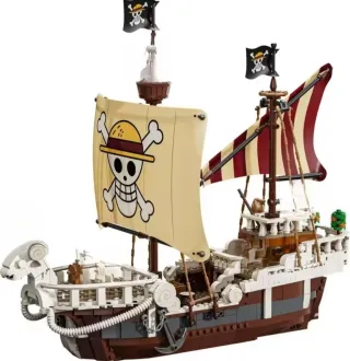 Piezas de construcción de un barco inspirado en One Piece. - Diseño detallado del barco. - Incluye velas y banderas. - Construcción tipo Lego.