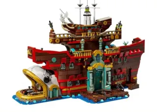 Réplica del Baratie, el restaurante flotante de One Piece, construida con piezas de Lego. - Diseño detallado del barco. - Incorpora la icónica forma de cisne en la proa. - Múltiples niveles y estructuras. - Base azul que simula el agua.