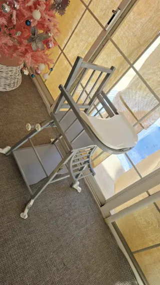 Trona de bebé de madera pintada en color gris. Perfecta para las comidas de los más pequeños. Se convierte en trona baja con ruedas para facilitar su movimiento - Bandeja desmontable. - Reposapiés. - Diseño clásico.