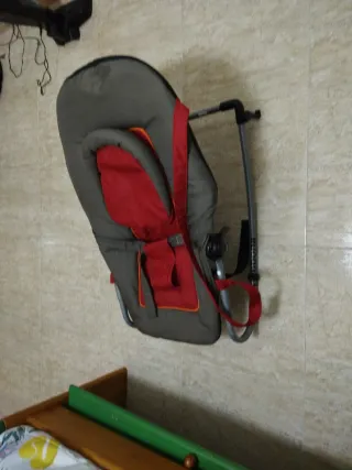 Hamaca para bebé en muy buenas condiciones. - Color principal gris oscuro. - Detalle interior en color rojo. - Ribete naranja en el cojín. - Arnés de seguridad de 3 puntos.