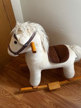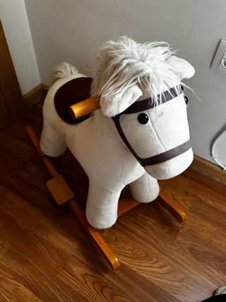 Caballo balancín de peluche blanco con detalles en marrón y asas de madera,no se ha usado apenas estaba de decoración en la habitación - Peluche suave al tacto. - Base de balancín de madera. - Asas de madera para sujetarse.