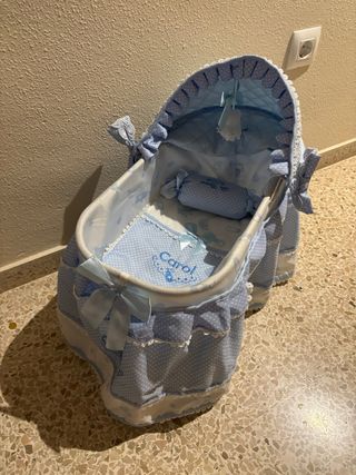 Precioso moisés para muñecas, ideal para jugar. Marca de Cuevas. No tiene nada de uso , ha estado de adorno en una habitación. - Diseño en color azul con lunares blancos. - Incluye cojín y manta. - Adornado con lazos y volantes.