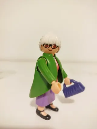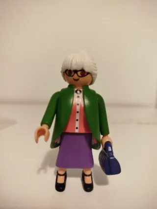 Figura de Playmobil que representa a una abuela. Viene con un bolso morado. - Abrigo verde. - Falda morada. - Zapatos negros. - Gafas.