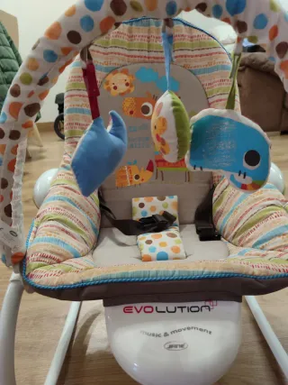 Hamaca para bebés de la marca Jane, modelo Evolution Music & Movement. Diseñada con un estampado alegre y colorido. - Estructura con base blanca. - Barra de juegos con peluches. - Tejido estampado con animales y lunares.