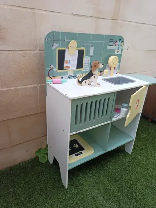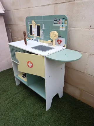 Divertida clínica veterinaria de juguete para los más pequeños. Ideal para fomentar el juego simbólico y el cuidado de mascotas. - Diseño colorido y atractivo. - Incluye accesorios como jeringuilla, báscula y estetoscopio. - Fabricada en madera resistente.