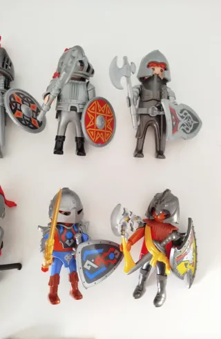 LOTE de figuras de Playmobil de temática medieval. - Incluye varios caballeros con armaduras y accesorios. - Figuras con escudos y armas. - Accesorios adicionales como cascos y espadas.