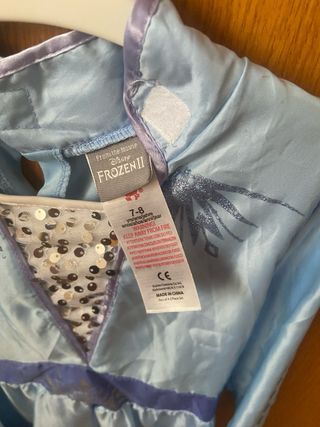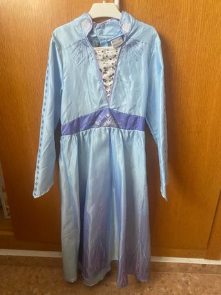 Vestido de Elsa de Frozen, perfecto para disfraces o fiestas. - Color azul claro con detalles plateados y morados. - Mangas largas con estampado. - Falda con degradado y detalles de escarcha. - Cuello alto con adornos. -Mas los zapatos talla 30-32 aprox