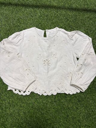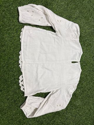 Bonita camisa blanca de manga larga con detalles bordados. - Cuello redondo. - Cierre de botón en la espalda. - Puños elásticos. - Bajo con acabado festoneado.