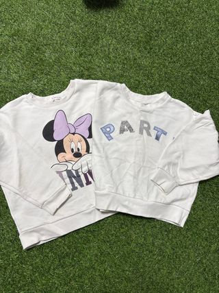Conjunto de dos sudaderas blancas, una con estampado de Minnie Mouse y la otra con la palabra Party - Sudadera blanca con Minnie Mouse y lazo morado. - Sudadera blanca con letras Party en tonos azules y plateados