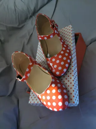 TALLA 33. Zapatos de estilo sevillana para niña con un divertido estampado de lunares. - Color rojo brillante. - Diseño con tira y hebilla. - Estampado de lunares blancos.