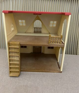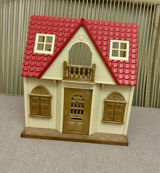 Casa de muñecas Sylvanian Families con tejado rojo y detalles encantadores. - Diseño de dos plantas. - Balcón en la parte superior. - Puerta principal con detalles. - Ventanas con contraventanas.