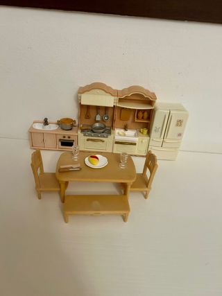 Set de cocina de Sylvanian Families con todos los accesorios. - Incluye cocina, nevera, fregadero y horno. - Mesa de comedor con dos sillas y un banco. - Plato con comida y vasos.