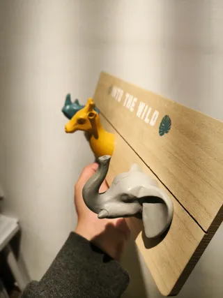 Original colgador de pared con diseño Into the Wild. Nuevo a estrenar. De Maisons du monde. - Tres ganchos con forma de cabeza de animal: rinoceronte, jirafa y elefante. - Fabricado en madera. - Diseño divertido y colorido.