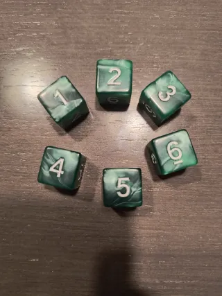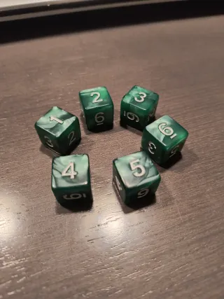 Conjunto de seis dados D6 con un diseño marmolado en color verde. Perfectos para juegos de mesa. - Seis dados D6 incluidos. - Diseño marmolado. - Color verde intenso.