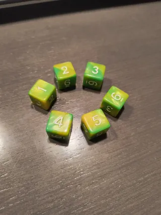 Conjunto de seis dados D6 con un diseño marmolado único en tonos verde y amarillo. Perfectos para tus juegos de mesa. - Seis dados D6 incluidos. - Diseño marmolado verde y amarillo.