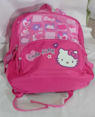 Mochila infantil con un divertido diseño de Hello Kitty en color rosa. - Estampado frontal con varios cuadros temáticos. - Detalle de Hello Kitty sonriente en el bolsillo. - Bolsillo frontal con cremallera. - Tirantes ajustables.
