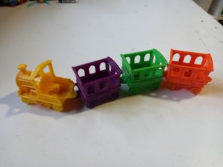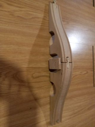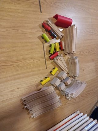 Tren de Madera con 45 pzs Incluye: 6 lineas rectas largas 2 lineas rectas cortas 2 w 18 curvas 4 soportes de puente 4 puentes 1 tunel 9 vagones 1 madera para mercancía de bagón ESCUCHO OFERTAS!!!
