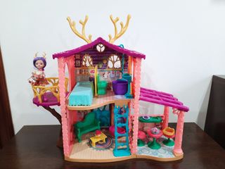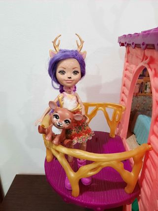 Casa ciervo con balcón de Enchantimals. Casa de 53cm de altura, con 5 zonas de juego (todas ellas con sus complementos): dormitorio, baño, salón, cocina y balcón. Incluye la Enchantimals ciervo con su mascota. Está impecables. Precio nueva:50€.