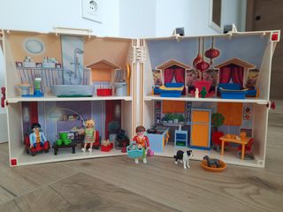 Casa-maletín Playmobil. Incluye tres figuras de personajes, tres cachorros de perro y un ejemplar adulto. Además de todos los accesorios y mobiliario. Está impecable! Lo único es que a una cama le falta una pieza blanca fácilmente reemplazable por cartulina blanca, por ejemplo. Nueva: 53€