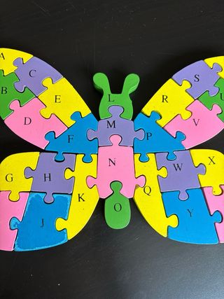 Rompecabezas de madera con forma de mariposa. Ideal para niños. - 26 piezas de colores. - Diseño de mariposa. - Material de madera resistente.