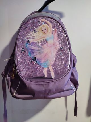 Preciosa mochila con purpurina, ideal para niñas. Tiene un diseño precioso con una bailarina y mariposas. - Mochila de color morado. - Diseño con purpurina brillante. - Imagen de una bailarina y mariposas. - En perfecto estado.