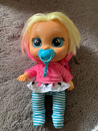 Muñeca de la colección Bebés Llorones, modelo Alice. - Pelo rubio. - Ojos grandes y azules. - Incluye chupete azul. - Viste un conjunto de sudadera rosa y falda con estampado. Llora lágrimas de verdad y emite sonidos reales al quitarle su chupete; pónselo otra vez o no dejará de llorar. Está sin pilas