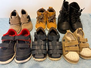 Conjunto de varios pares de calzado para niño. - Botas de ante color camel. - Botas negras estilo militar. - Sandalias azules. - Zapatillas deportivas azul marino. - Zapatillas de lona color camel. Tallas de la 21 a la 25