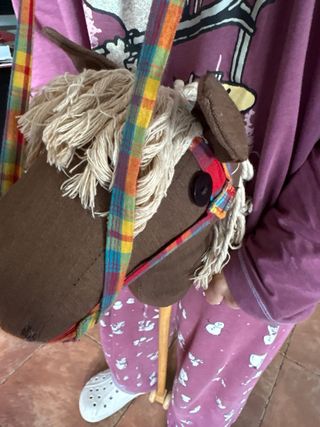 Dos caballitos de juguete de tela con arneses de colores. - Caballito marrón con arnés a cuadros. - Caballito beige con arnés a cuadros. - Melena de hilo. - Ojos de botón. - son más bonitos que en las fotos, buena calidad, 75 cm hasta la empuñadura, 100 cm de altura total