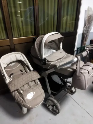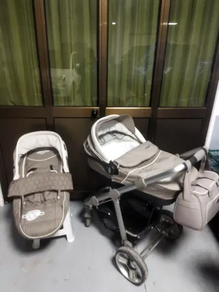 Conjunto de cochecito para bebé de dos piezas. Marca brevi. - Incluye capazo y silla. - Color beige y blanco. - Incluye bolso a juego. Y capota de plástico para la lluvia. En muy buen estado