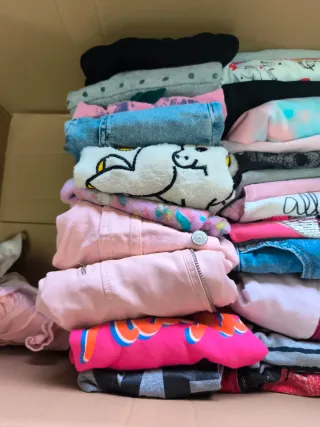 Lote de ropa para niña de 8 años. - Variedad de prendas dobladas. - Incluye 6 vestidos 1 pijama 1 chaqueta rosa vaquera 1 chaqueta cuero rosa 2 faldas 2 vaqueros 4 sudaderas 5 camisetas de manga larga - Tonos rosas, negros y grises.