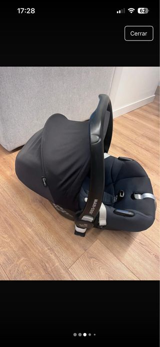 Silla de coche Maxi-Cosi en color negro. Incluye capota. Necesita limpieza - Capota de tela negra. - Asiento acolchado. - Arnés de seguridad.
