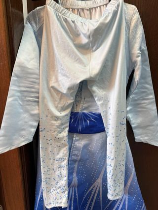 Disfraz inspirado en los personajes Anna y Elsa de Frozen. Ideal para fiestas o juegos. - Vestido azul con detalles brillantes. - Mangas largas de tul transparente. - Capa de tul incorporada. - Talla 5-7 años Se venden por separado 8e o juntos 15e.
