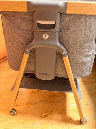 Mecedora Bugaboo en color gris, ideal para el descanso. - Tapicería suave y acolchada. - Arnés de seguridad de 5 puntos. - Diseño ergonómico. - Estructura de madera.