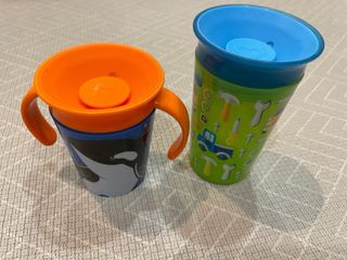 Dos vasos antivuelco para niñ@s de la marca Munchkin. Ideales para que los más pequeños aprendan a beber solos. - Son de plástico resistente y ligero. - Tienen dos asas para facilitar el agarre. - Se encuentran en buen estado.
