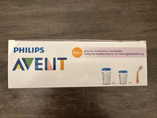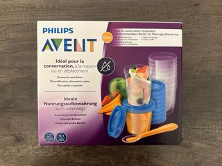 Vaso de almacenamiento de comida Philips Avent (5 x 240 ml). Con tapa antiderrames. Para almacenar y transportar herméticamente. Para saber fácilmente las fechas y el contenido. Nevera y congelador organizados. Aptos para nevera/congelador. Fácil de usar. Algún vaso se ha usado, otros son nuevos.