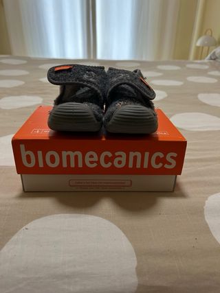 Zapatillas infantiles de la marca Biomecánics en talla 20. Son cómodas y cuentan con un diseño divertido. - Cierre de velcro. - Exterior de fieltro gris con bordados. - Detalle de lengüeta naranja en la parte trasera.