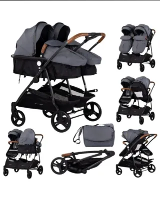 Carro gemelar en color gris, ideal para dos bebés. Incluye bolsa. - Dos capotas independientes. - Cesta de almacenamiento inferior. - Plegable para facilitar su transporte. - Capota para lluvia incluida. - Dos colchones para más comodidad de los bebés.