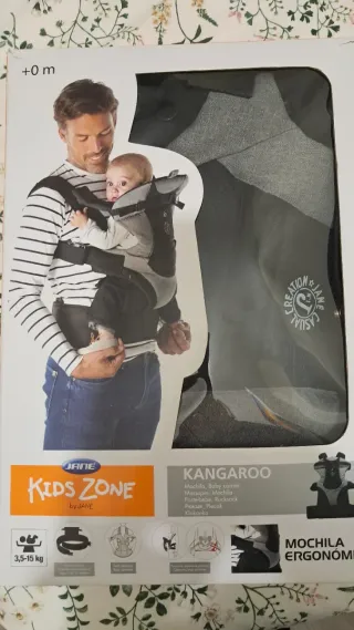 Mochila portabebés marca Jané, modelo Kangaroo. - Apta desde el nacimiento (0+ meses). - Soporta un peso de 3,5 a 15 kg. - Diseño ergonómico. - Color gris y negro.