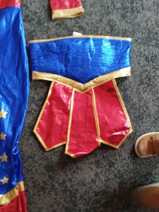 Talla 11-13 años, de hombro hasta abajo 121 cm Disfraz de Wonder Woman para niñas. Incluye el traje completo y accesorios. - Traje de cuerpo entero con detalles en rojo, azul y dorado. - Incluye brazaletes. - Diseño inspirado en Wonder Woman.