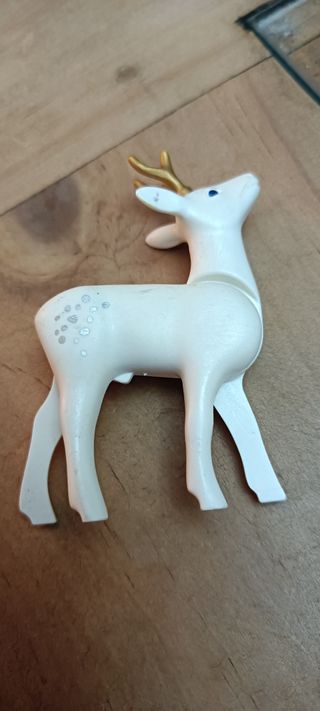 Figura de un ciervo blanco de Playmobil con detalles dorados en las astas y plateados en el lomo. - Diseño de ciervo. - Color blanco con detalles. - Astas doradas. Cabeza articulada. Viene con los set de Fairys hadas