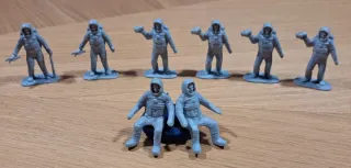 8 figuras de astronautas de plástico de 5 cm aprox., tal como se ven en las fotos. Poses variadas, aunque se repiten. Hay 2 sentadas que no se sostienen solas. Ojo, para la foto las he apoyado en un objeto que NO SE INCLUYE Se venden en conjunto, no por separado, sale a 1 euro la figura. Regalo una a la que le falta una mano (ver última foto).