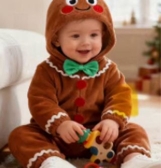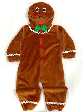 Adorable disfraz de galleta de jengibre para niños de 24-36m (talla para 100cm de alto y 56cm de pecho). Perfecto para fiestas o para la temporada navideña. - Diseño de galleta de jengibre. - Tejido suave. - Capucha con detalles faciales. - Lazito verde y botones rojos de decoración. - Cierre de cremallera. - Tobillos y muñecas con elástico.